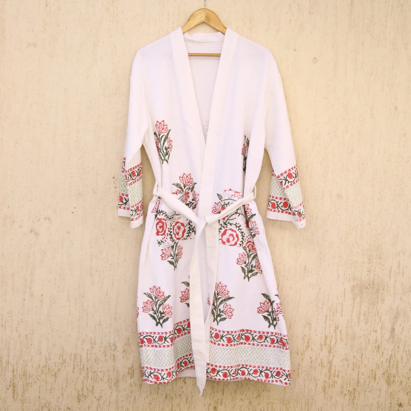 Made from 100% cotton, it features a soft waffle texture and a relaxed kimono-style silhouette with a shawl collar and open front—blending timeless design with everyday ease. Each bathrobe is beautifully adorned with traditional hand block prints, a reflection of skilled craftsmanship and cultural artistry.